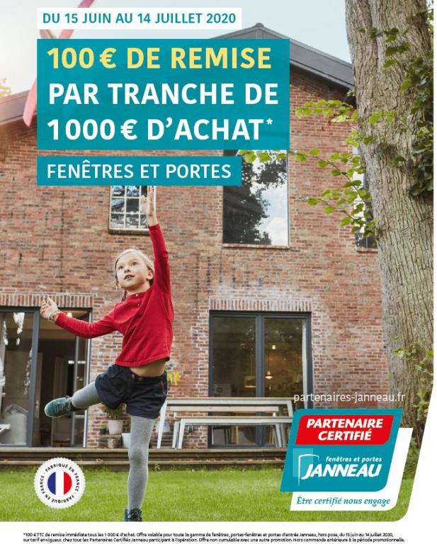 100 € TTC de remise immédiate tous les 1 000 € d’achat. Offre valable pour toute la gamme de fenêtres, portes-fenêtres et portes d’entrée Janneau, hors pose, du 15 juin au 14 juillet 2020, sur tarif en vigueur, chez tous les Partenaires Certifiés Janneau participant à l’opération. Offre non cumulable avec une autre promotion. Hors commande antérieure à la période promotionnelle.